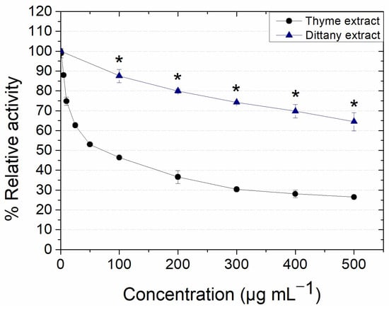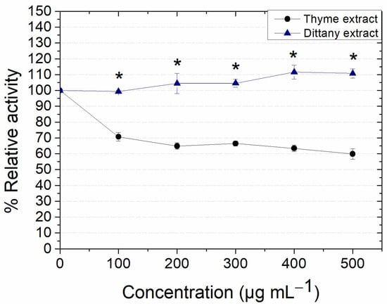 Candida rugosa relative activity (%) in the presence of different concentrations of thyme and dittany extracts. Significant differences (p < 0.05) between the two groups at each concentration are represented by a single asterisk, using t-test analysis.