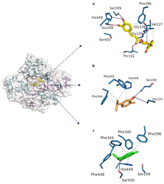 Molecular docking is a widely used methodology to study the binding affinity of small molecules (ligands) to receptors (such as enzymes). They can provide rational explanations for the observed regioselectivity of biocatalysts and can contribute to the development of new drugs since enzymes are important inhibitor targets [71,72]. In this work, molecular docking was used as a tool to predict the binding orientation of rosmarinic acid, carvacrol and thymol in order to gain a deeper understanding of the underlying interactions that might influence their inhibitory activity. Tables S3 and S4 show data for rosmarinic acid, carvacrol and thymol from the molecular docking method onto the active site of Crl. According to the results, all compounds interacted favorably within the active site of the protein, with rosmarinic acid demonstrating the highest binding affinity (Table S3). More specifically, rosmarinic acid interacts with many residues hydrophobically, while also participating in many hydrogen bonds either as a donor or as an acceptor, due to its numerous hydroxyl groups (Figure 3a). Two key interactions that might influence its inhibitory activity are the hydrogen bonds between the catalytic residues, Ser209 and His449, with one of the hydroxyl groups of its caffeic acid ester moiety. Indeed, serine hydrolases require the Ne atom of the imidazole ring to be non-protonated to activate the catalytic serine. Thus, the binding conformation of rosmarinic acid in such a conformation is believed to hinder the ability to activate Ser209.