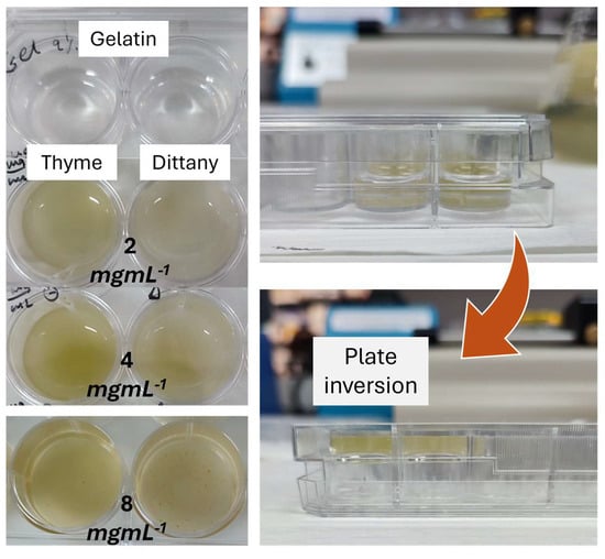 Photographic evidence of the formation of hydrogels containing either thyme or dittany methanolic extracts at concentrations of 4 or 2 mg mL−1. Also, dried hydrogels containing extracts at the concentration of 8 mg mL−1 are presented.