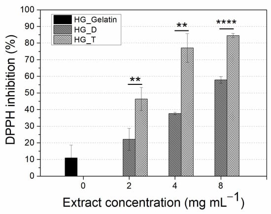 Antioxidant activity of gelatin hydrogel (HG_Gelatin) and gelatin hydrogels containing extracts with increasing extract concentration. Significant differences (p < 0.05) between the two groups at each concentration are represented by asterisks (** p ≤ 0.01; **** p ≤ 0.0001), using t-test analysis.