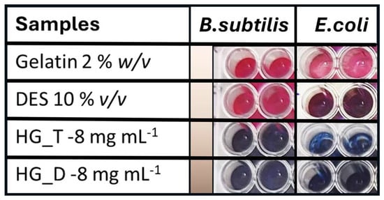 The antibacterial activity of gelatin hydrogels containing dittany (HG_D) and thyme (HG_T) methanolic extracts at the concentration of 8 mg mL−1 was also studied against Bacillus subtilis and Escherichia coli strains using the growth inhibition test, based on a previous study [43]. In particular, the antibacterial activity of extracts, gelatin and DES Bet:PG (1:4) was investigated both separately and as the liquid mixture that leads to the formation of hydrogels. The assay was performed at 200 μL final volume in a 96-well plate. Hydrogel mixtures containing gelatin (2% w/v), DES (10% v/v) and extracts (8 mg mL−1) were prepared in the well through adding 50 μL LB broth, 30 μL gelatin solution (13.3% w/v, dissolved in LB broth) and 20 μL of extracts (80 mg mL−1 dissolved in DES), followed by the addition of 100 μL of bacterial suspension (final bacterial concentration 5 × 105 CFU/mL). Concerning gelatin, the powder was dissolved in LB broth and the concentration studied was 2% w/v, while DES was tested at the concentration of 10% v/v. Control samples containing 5 × 105 CFU mL−1 of each strain in LB broth were also prepared. After the preparation of all samples, the plate was incubated for 24 h at 37 °C. The antibacterial activity was detected after the addition of 10 μL of resazurin from a stock solution of 2.5 mg mL−1 in sterilized double distilled water at each well [40] and incubation for 2 h at room temperature before the color observation. The antibacterial activity was evaluated in triplicate.