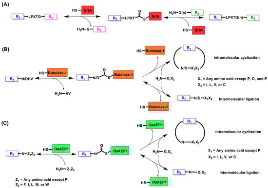 - Dorr, B.M.; Ham, H.O.; An, C.; Chaikof, E.L.; Liu, D.R. Reprogramming the Specificity of Sortase Enzymes. Proc. Natl. Acad. Sci. USA 2014, 111, 13343–13348. [Google Scholar] [CrossRef]