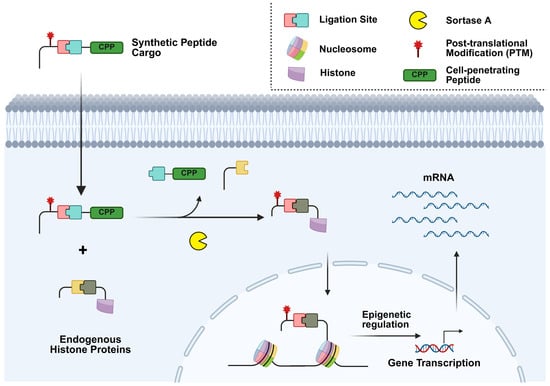 The modification of histone H3 has been further expanded from in vitro to in cellulo through the use of SrtA for sortase-mediated metathesis (SMM) (Figure 2) [23]. Truncated histone H3 was synthetically produced with an LPATGG recognition sequence for 6M-Srt to cleave between T and G, and thus produce an α-amine glycine substrate [23]. To expand the substrate scope, a peptide also carrying the LPATGG sequence was introduced so that it could also be recognized by sortase A and provide the LPAT sequence needed for ligation [23]. This allows for the addition of a cell-penetrating peptide (CPP) for in cellulo delivery and α-amine glycine on histone H3, which is lacking the endogenous tail [23]. The use of SMM allows for the delivery of histone H3 tails with site-specific modifications such as PTMs to study their impact on epigenetics in live cells [23].