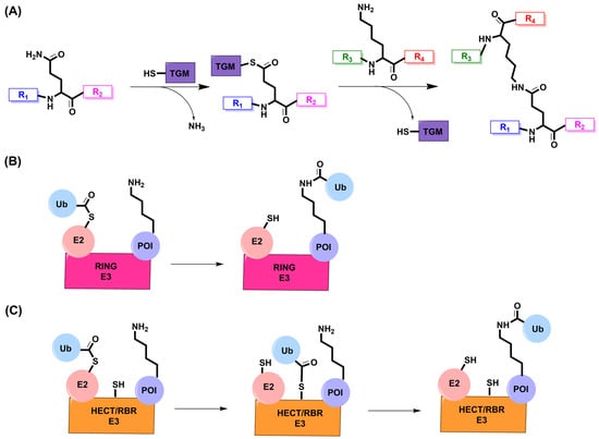 Enzymatic peptide ligation through isopeptide bond formation. (A) A catalytic cysteine on TGM attacks the γ-carboxamide group of glutamine to produce a thioester intermediate and release ammonia. The thioester intermediate undergoes an aminolysis reaction with a primary amine on lysine to release the enzyme and create an isopeptide bond. R1–R4 are peptide or protein sequences. (B) One-step transfer of ubiquitin from E2 onto a protein substrate by RING E3 ligases. The thioester intermediate between E2 and ubiquitin undergoes an aminolysis reaction with lysine on the protein substrate. (C) Two-step transfer of ubiquitin from E2 onto a protein substrate by HECT and RBR E3 ligases. A catalytic cysteine on HECT/RBR attacks the thioester to transfer ubiquitin onto the C-terminus of the E3 ligase. The thioester intermediate between HECT/RBR and ubiquitin undergoes an aminolysis reaction with lysine on the protein substrate. POI: protein of interest.