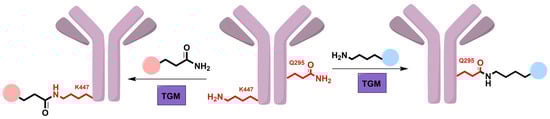 The production of site-specific ADCs via an isopeptide bond formation catalyzed by TGM. Despite ~60 glutamine residues existing on IgG antibodies, studies have shown that only Q295 on the Fc domain can act as an acyl donor for a ligation reaction by TGM. Similarly, K447 located on the C-terminus of the Fc domain is the only lysine residue that can act as an acyl acceptor. Drugs bearing either a primary amine or glutamine residue can then be conjugated to these residues in a site-specific manner.