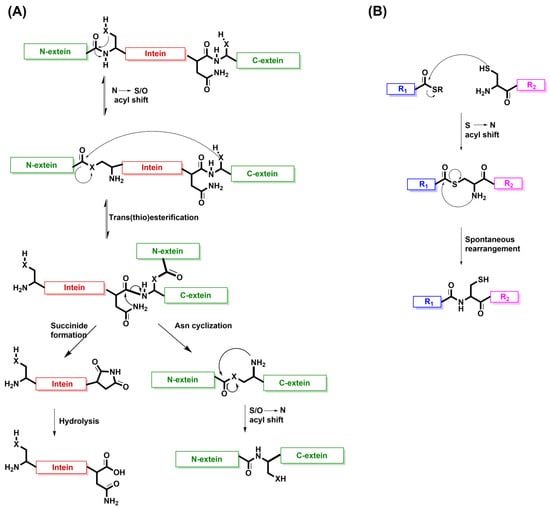 The existence of inteins was first discovered in 1990 by two independent groups, Kane et al. and Hirata et al., and for the past several decades, they have been heavily studied for their roles in protein ligation [121,122]. Inteins are believed to act as self-catalyzing enzymes which are able to undergo cis- or trans-splicing to fuse together their external protein sequences known as the N- and C-exteins [123,124]. Canonical intein splicing is a multistep process, starting with either cysteine or serine on the N-intein, which acts as a nucleophile and attacks the adjacent carbonyl group linked to the N-extein [125,126,127,128]. This produces a reversible N-to-S or N-to-O acyl shift to produce a linear intermediate. A trans(thio)esterification step, promoted by either cysteine or serine on the C-extein, links the N- and C-exteins together. To resolve the branched intermediate that is a product of this reaction, there is a rate-limiting irreversible cyclization of a conserved C-terminal asparagine. A succinimide is produced release the connected exteins from the intein. The succinimide formed on the intein undergoes a hydrolysis reaction to restore the intein. Finally, the exteins undergo an acyl shift, either S to N or O to N, to create the native peptide bond and complete the ligation reaction (Figure 5A).