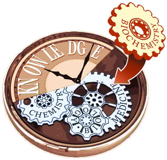 This collection of Special Issue papers collectively illustrate biochemistry’s central role in addressing global challenges—environmental monitoring, sustainable production, drug development and health diagnostics (Figure 1). The papers emphasize the interplay between molecular mechanisms, translational applications and interdisciplinary collaboration, showcasing biochemistry as a dynamic field at the boundary between life sciences, medicine and sustainability. Allegorically, biochemistry represents a key cog in the “clock of the knowledge”, dynamically joining several scientific fields, such as chemistry, biology and medicine, among others, for perfect shared innovation and development (Figure 2).