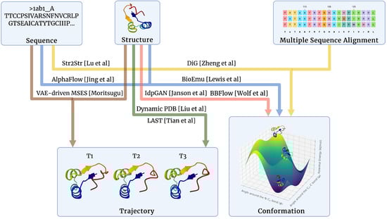 - Jing, B.; Stärk, H.; Jaakkola, T.; Berger, B. Generative Modeling of Molecular Dynamics Trajectories. arXiv 2024, arXiv:2409.17808. [Google Scholar] [CrossRef]