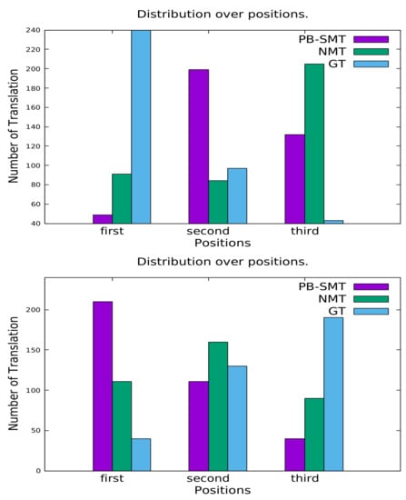 Using the submissions from the ranking task, we also obtained the distributions of the translations by the PB-SMT, NMT, and GT MT systems over the three ranking positions, which are shown in the upper graph of Figure 1. We see here that the majority of the translations that the evaluators tagged as “best” (cf. “first” in the upper graph of Figure 1) were from GT followed by NMT and PB-SMT. In case of the “worst” position (cf. “third” in the upper graph of Figure 1), we saw that the majority of the translations were from the NMT systems followed by the PB-SMT and GT MT systems. When we looked at the second position, we saw that PB-SMT was the winner, and NMT and GT were nearly neck-and-neck.