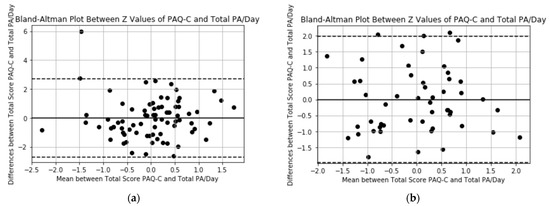Visual data inspection with Bland–Altman plots in Figure 1 shows that although the line for mean difference between Z values of total PAQ-C score and total PA is close to zero for both 9-year-old and 12-year-old children, the limits of agreement (mean ± 1.96 × SD) are wider for 9-year-old children (±2.695 vs. ± 1.972).