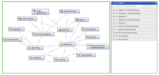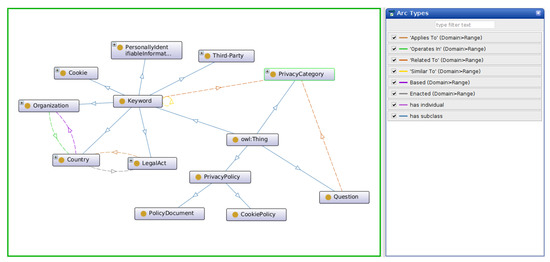 The ontology is divided into four main classes derived from the standard OWL root class for everything owl:Thing: Keyword, PrivacyCategory, PrivacyPolicy, and Question. The following are rules for creating the rest of the classes and individuals. Refer to Figure 2 and Figure 3.