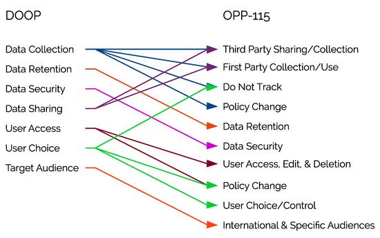 Owing to the individual and subjective nature of ontologies, ontology validation is a difficult process. DOOP was validated in two ways: CQs and data driven. CMU’s OPP-115 data set was used as the primary benchmark for validation. Since there were 10 policy annotators, there were many overlaps in the labelling of policies, as well as multiple labels for the same policy. To reduce redundancy, the authors of OPP-115 consolidated annotations with three convergence thresholds: , , and 1. These were calculated as normalized aggregated overlap of spans of text assigned the same data attribute for the same data practice identified by multiple annotators. For our validation, annotations from all three thresholds were considered. Furthermore, OPP-115 annotators have classified their annotation under 10 categories which had to be mapped to our 7 categories; Figure 4 shows this mapping. The mapping was necessary because at the time of undertaking this research OPP-115 data set had not yet been released so the categories introduced by [41] were used. For validation, four experiments were conducted that evaluated various aspects of the ontology: