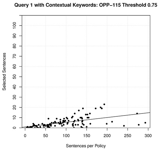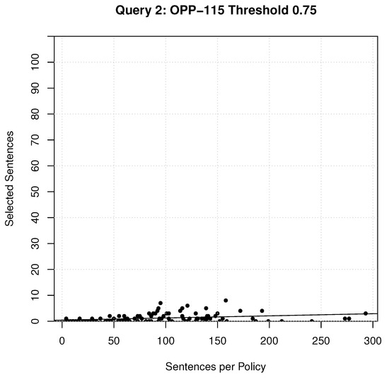 To further investigate these results, additional analysis of the individual results from experiments for all of the thresholds and queries was conducted. Figure 5, Figure 6 and Figure 7 show the results of the queries for the threshold. A radical relationship between the number of sentences selected and the length of the policies was expected, where the reading proportionally increases as the length of the policies increase, but then stabilize at some horizontal asymptote. However, this did not occur. A strong positive linear relationship was observed for the first experiment (Figure 5), no correlation for the second experiment (Figure 6), and weak positive for the third experiment (Figure 7). A qualitative analysis provided several clues for these behaviours: