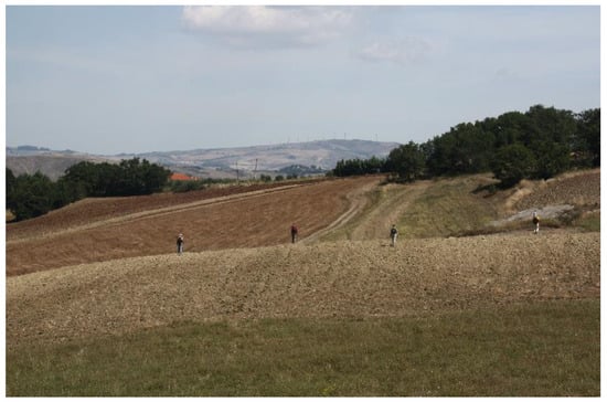 The field survey conducted consists of walking in large rural regions, usually in teams following regular lines [6,7,8,9] (Figure 1). By observing the soil surface, archaeologists can detect ruins or concentrations of artefacts, the remains of walls or floors that have surfaced by ploughing, and/or erosion from (buried) archaeological sites. These finds are a sound indicator of the presence of archaeological heritage located underneath or in the surroundings of their discovery. Since the 1970s, data about the state of preservation of ancient settlements have been massively mapped by archaeologists during field surveys over large rural landscapes in the Mediterranean [10,11]. These raw data are important for both territorial monitoring of cultural resources in heritage management (by showing where archaeological remains are located, the future impact of landscape changes to sites can be better anticipated, managed, and guided [12,13,14,15,16,17,18,19]) and landscape archaeology (these data underpin ancient settlement patterns and can be used in regional analyses of large-scale/long-term cultural phenomena, such as colonisation, migration, land-use, environmental changes, and economic production (e.g., Refs. [20,21,22,23,24,25,26,27,28,29,30,31,32,33,34,35,36,37]; for an overview of Mediterranean surveys: Ref. [11]).