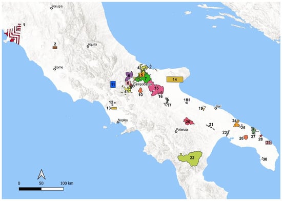 Research areas of the survey projects digitised during the internships for Central–Southern Italy (numbers 1–30 in Table A1). Basemap: ESRI World Hillshade, accessed on 8 August 2022. Figure by author.