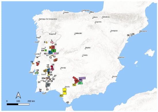Research areas of the survey projects digitised during the internships for the Iberian Peninsula (numbers 1–43 in Table A2). Basemap: ESRI World Hillshade, accessed on 11 August 2022. Figure by author.