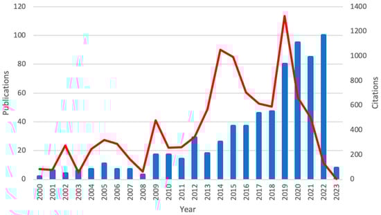 Temporal distribution of the literature: a comparison of total publication (bars) and citation counts by year for the period 2000–2023 (lines).