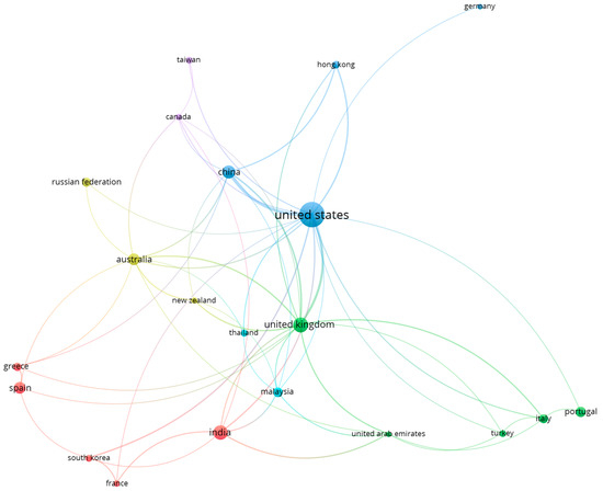 Co-authorship analysis is a method used in bibliometric research to identify patterns of collaboration among authors in a specific field of study. This method is particularly useful in identifying key actors, institutions, and research trends within a given field and identifying research gaps and opportunities. Co-authorship analysis can be performed at different levels of analysis, including the individual author, the institution, and the country [14,20]. In this study, co-authorship analysis was performed at the country level to identify patterns of collaboration among authors from different countries in the field of technology and tools in the hospitality sector. The country unit of analysis is particularly useful in identifying international collaborations and in understanding the global distribution of research activities in a given field [12,17,20]. The results of the co-authorship analysis at the country level were used to identify the most active countries and institutions in the field of technology and tools in the hospitality sector, as well as to understand the dynamics of international collaborations in this field.