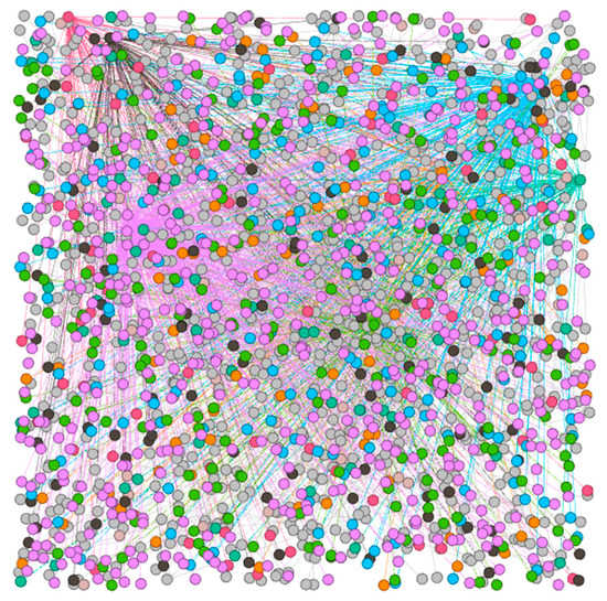 The analysis revealed a high degree of community structure in the network, as indicated by the modularity index of 0.895 [19]. This suggests that the authors in the network tend to be more connected to other nodes within the same group or cluster than to those outside of it, potentially indicating similar research interests or collaboration on similar projects. The modularity classes were used to identify the group of authors that are most tightly connected, with the highest class (purple color) having a 25.75% representation, as shown in Figure 3. The elements in this class are the authors and the number of elements, in this case, 465, represents the number of authors that have been grouped.