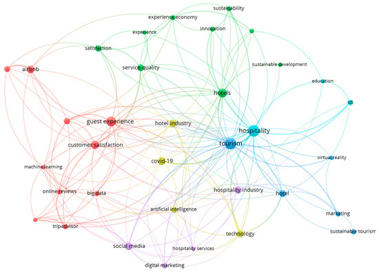 An analysis of the co-occurrence of keywords in the authors’ papers was conducted using VOSviewer software. Of the 2069 total author keywords, a threshold of seven appearances was set to identify the most prevalent keywords. This analysis produced six clusters, with the highest co-occurring keywords being tourism (46), hospitality (46), guest experience (33), and hotels (29). Table 8 presents a summary of the top 15 keywords, including their number of occurrences and total link strength, while Figure 4 illustrates the network mapping of the co-occurrence of keywords analysis. The clusters were then labeled and analyzed to gain insights into the prevalent themes and patterns in the authors’ research.