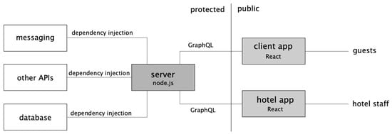 The project structure employed in this study consists of three separate applications, each serving a specific purpose, with shared code libraries that allow for intercommunication and code reuse. The entire project is held within a monorepo and written in TypeScript. One of the applications is a Node.Js server, responsible for serving as a common API and database access point for the other two React-based applications. The first React app is designed to be utilized by the hotel for data entry and order management purposes, while the other app is aimed at providing a convenient interface for clients. Communication between the Node server and the React apps is established via GraphQL, enabling seamless data exchange between the different components of the system. The shared code libraries contain type definitions, which are utilized across all applications and ensure consistency and compatibility of code. Requests to the Node server are authenticated using JWT, ensuring in this way secure access to the data stored in the system, as shown in Figure 6.