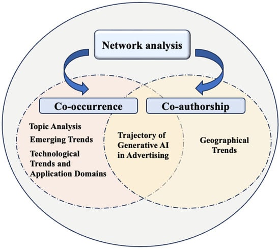 To systematically map the knowledge domain of Generative AI in advertising, we propose a multidimensional analytical framework grounded in scientometric network analysis. This framework, visualized in Figure 1, leverages the complementary strengths of co-occurrences and co-authorship network analyses to examine the intricate relationships between AI, advertising, and the generative model to give distinct perspectives: (1) Topic Analysis, which delves into the prominent themes and subtopics that characterize the current landscape of AI in advertising, with a particular focus on emerging trends and the application of Generative AI techniques. (2) Emerging Trends, which shed light on the cutting-edge advancements and innovations shaping the field of AI in advertising. Through dynamic analysis of keyword co-occurrence patterns over time, we can pinpoint the latest developments and research frontiers, providing valuable insights into the evolving nature of Generative AI applications. (3) Geographical trends, which acknowledge the growing importance of national contexts in AI research. By examining co-authorship, networks, and publication patters across different countries, we can discern how country-specific trends influence the adoption and use of Generative AI techniques. (4) Technological Trends and Application Domains, which explore the interplay between various AI technologies and their potential application in diverse advertising domains. By analyzing the co-occurrence of keywords alongside technological advancements, we can map the evolving technological landscape and identify promising application areas for Generative AI. Lastly, (5) Trajectory of Generative AI in advertising, which offers a diachronic analysis of the field’s development, tracing the historical emergence and evolution of Generative AI in advertising research. Through the combined analysis of co-citation and co-authorship networks, we can identify seminal publications, influential scholars, and critical turning points that have shaped the field’s trajectory.