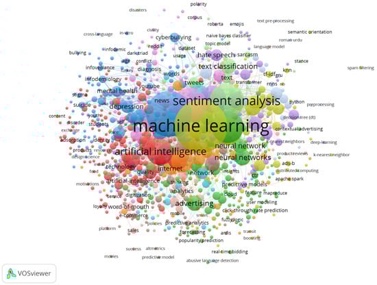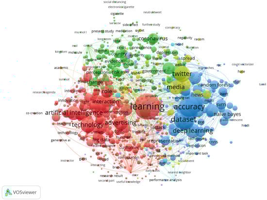 Network analysis, a technique that unveils hidden relationships within complex data, has become an essential tool in exploring the intricate landscape of advertising [43,44]. It goes beyond studying isolated elements by revealing patterns and identifying influential players driving the field’s evolution [45,46]. We utilized two unique network analysis tools—VOSviewer and NodeXL Pro—to acknowledge its potential. These tools allowed us to delve into the interconnected landscape of AI in advertising, providing valuable insights into its evolution and key players.