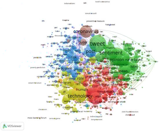 Finally, the total link strength, representing the cumulative strength of connections between terms, coincides with the prominence of “tweet”, “sentiment”, and “technology”. This cumulative strength underscores the collective influence and interdependence of these terms, highlighting their integral role in shaping the discourse and directions within the AI research landscape.