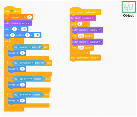 To address these challenges, an educational guide was developed, which can be seen in the section “Educational guide” in the Supporting Information. This guide outlines the steps taken through the creation of a Shmups-type video game inspired by the famous Star Wars fiction movie. This was chosen with the intention of motivating the student to create the project. Before that, this guide serves as a tool to help parents and educators introduce young students to basic mathematical concepts and acquire PC handling skills to tackle the challenge of learning block programming. After following the educational guide with the student, their performance was evaluated through a questionnaire, and their motivation and feelings after the learning process were assessed through a semi-structured interview.