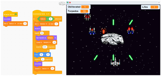 The ShuWars project was initiated following a project-oriented methodology [57], where the student gradually applied the concepts learned to create a game. Creativity was encouraged by assigning new functionalities, and the student was encouraged to present and explain their projects.