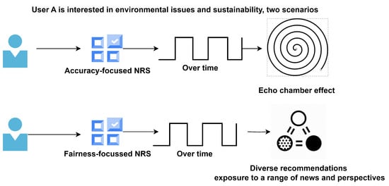 We present an example of a NRS, in in Figure 1, which considers User A, who frequently reads news articles related to environmental issues and sustainability. An NRS that focuses solely on accuracy would continuously recommend articles related to the environment and sustainability, based on User A’s past behavior. This can lead to an ’echo chamber’ effect [1], where the user is exposed only to news and opinions that align with their existing beliefs and interests. Conversely, the NRS prioritizing fairness might recommend a broader range of topics, including politics, economics, technology, and social issues.