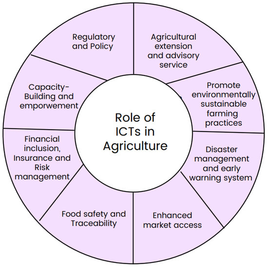 Nevertheless, it is imperative to acknowledge that ICTs, including mobile phones, serve as a bridge between researchers, extension agents, and farmers facilitating the exchange of knowledge and best practices [23]. Considering that it is crucial to acknowledge that smartphone adoption may still be limited in certain areas due to factors like affordability, digital literacy, and network reliability, it is noteworthy that smartphone ownership among smallholder farmers in developing countries is increasing. This trend is supported by a research study indicating a rise in smartphone ownership, attributed to decreasing smartphone costs and expanding mobile network coverage [24]. The integration of the agricultural sector with the growing use of mobile phones catalyzed policy advancements concerning mobile phone utilization across a spectrum of agricultural services [25]. This includes streamlined market accessibility, allowing farmers to connect with buyers, access pricing information, and broaden their market reach. Furthermore, by augmenting data collection and analysis, these tools enable more informed decision-making for refined agricultural practices [26] (Figure 1).