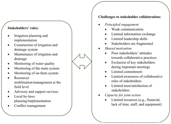 Recently, Ghana has taken strides to embrace stakeholder collaboration to enhance the irrigated agricultural sub-sector, notwithstanding the challenges impacting its performance. [47,48]. These stakeholders possess both interest and influence in key positions of importance [49]. Therefore, in this study, stakeholders are classified into three categories: (1) Key stakeholders, comprising those who hold significant influence or are vital for the success of the irrigation scheme. (2) Primary stakeholders (beneficiaries), who are directly impacted, either positively or negatively, by the outcomes of the irrigation scheme. (3) Secondary stakeholders, whose influence on the results of the irrigation scheme is marginal. The results show that many challenges affect this collaboration among them resulting in weak communication [50].