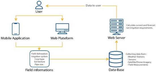 The typical architecture of an irrigation advisory platform includes six components (Figure 3); the proposed integrated framework establishes a comprehensive infrastructure for precision irrigation advisory which serves as a summary of what has been found in the literature review [51,52].
