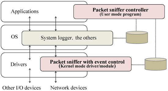 Until now, there have been studies to avoid or improve the situation by speeding up the processing, increasing the efficiency, and improving the performance of equipment in the network devices [5,6]. The proposed method is assumed for acquisition of communication events and packets at the end host, and achieves comprehensiveness of recording and continuity of record storage by controlling the permission/blocking of communication events using a filter driver in the protocol stack, according to the status of primary storage and secondary storage. Also, in order to discuss the usefulness of the research, the impact of the research, and its applications, we implement a packet sniffer tool that realizes the proposed method, and conduct experiments and discussions using it.