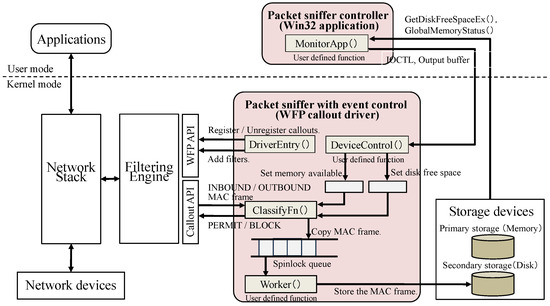 The packet sniffer tool based on the proposed method that runs on a Windows host is implemented as a KMDF-based callout driver of the WFP [9] and a user-mode Win32 Application program that works with the callout driver, as shown in Figure 3. I/O control code (IOCTL) [10,11] is used to link the WFP callout driver and Win32 application. When running an application, tool users can specify operating and control modes using command line arguments. The application acquires the free space in the primary storage and the free space in the secondary storage, and notifies the driver along with information on the operation mode and control mode.