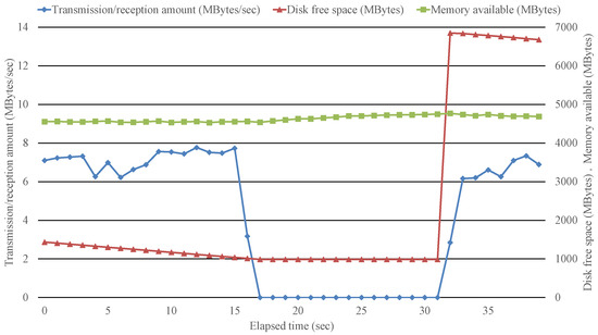 We measured the disk free space, memory free space, and transmission/reception amount when the iperf (UDP, inbound (PC2 to PC1), bandwidth 100 Mbits/s) and Tshark are executed in PC1. As shown in Figure 4, when the free space on the disk is exhausted at 35 s, the Tshark stops acquiring and recording packets; however, the iperf continued to send packets, and the comprehensiveness of the recording is lost. When rotating files that record packets with a fixed file size and a fixed number of files, if the log generation speed exceeds the log transfer speed to the outside, the past files will be overwritten, making it difficult to continue recording storage.