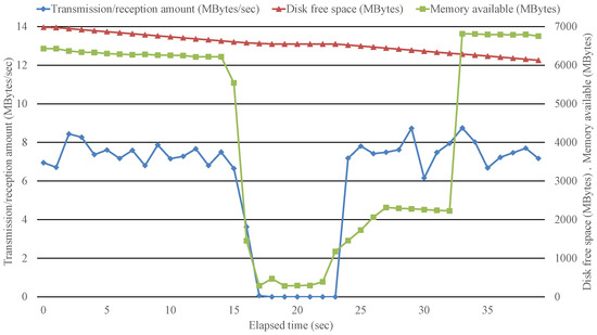 Using PC1 (Windows 10 Pro, 64-bit Test mode, Memory: 8 GB, CPU: Intel(R) Core i7-10750H 2.60 GHz, SSD: 128 GB) and PC2 (Windows 7 Pro, 32-bit, Memory: 4 GB, CPU: Intel(R) Core i7-5557U 3.10 GHz, SSD: 128 GB), we record the disk free space (disk free space on C drive), memory free space (memory available), and transmission/reception amount, while using iperf [19] to generate the test traffic. PC1 and PC2 are connected using a 1 GBps bandwidth hub and an Ethernet full-duplex cable, and each PC keeps its OS up to date and runs only the programs used in the experiment. The disk free space and memory free space were obtained using a Win32 application we created ourselves in which called GetDiskFreeSpaceEx() and GlobalMemoryStatus(), respectively, at 1 s intervals. The transmission/reception amount was obtained from the iperf measurement result output. In PC1, we executed the Tshark, implemented tool, iperf in server mode, and Testlimit [20] to consume a certain amount of physical memory. In PC2, we executed iperf in client mode. The Tshark and implemented tool are configured to create a new log file and record the data there if the size of the log file exceeds 2 GB. The implemented tool is configured to block communication at the NDIS layer (LLC layer in link layer) when the disk free space becomes less than 1 GB or the memory free space becomes less than 900 MB.