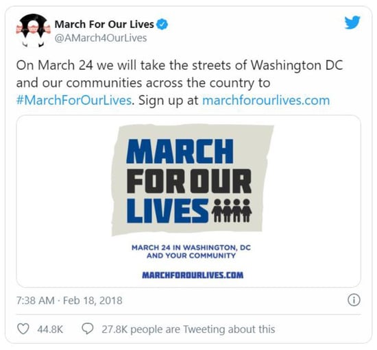 On 24 March 2018, the March for Our Lives rally in Washington D.C. and its subsequent events, which included 880 sibling protests, were held in the U.S. and globally, and recorded as the biggest anti-gun violence protest in U.S. and world history. The March for Our Lives movement was initiated in response to the Marjory Stoneman Douglas (MSD) High School mass shooting in Parkland, Florida on 14 February 2018. The event was recorded as the deadliest mass school shooting in the U.S. and yielded 34 casualties, including 17 deaths and 17 injured people. Shortly after the MSD mass shooting event, some of the surviving students founded “Never Again MSD” and organized the March for Our Lives movement to call out policymakers to take immediate and meaningful action on gun control policy [1]. On 18 February 2018, as the founders of the March for Our Lives movement, Never Again MSD members released the March for Our Lives rally in Washington D.C. on 24 March 2018 on Twitter via the @AMarch4OurLives March for Our Lives Twitter handle (Figure 1). After the MSD mass shooting and the announcement of the rally, heated public conversations generated hashtags on mass shootings, gun violence, and control on social media, such as #neveragain, #marchforourlives, and #enoughisenough. Particularly, the hashtag #marchforourlives was shared more than 3.6 million times starting from the announcement of the March for Our Lives (MFOL) movement on Twitter (see Figure 1).