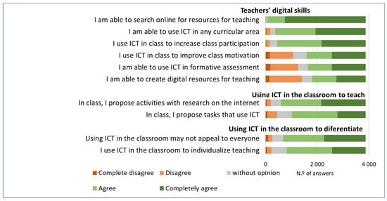 The first and second sections of the questionnaire follow the general idea that it was necessary to capture the perceptions as well as the practices of teachers. Such an idea is related to the reported difference between in-service teachers’ abilities to use digital technologies for instructional planning or as a teaching resource and their competence in guiding student-centered activities or developing students’ skills [].