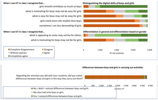 5. The overwhelming majority of teachers did not find differences between the uses that boys and girls make of digital technology. Therefore, they do not act in a way to promote digital skills differently among girls. However, they seem to be worried about differences among students and said that they work to reach all students in spite of any differences. The possible explanation for such a result could be partially based on the fact that teachers do not distinguish digital access, quality level of digital use made by students, and quality achievement concerning the digital skills attained by boys and those attained by girls. Such an explanation is corroborated by the other finding of this study: that male teachers perform more digital activities than female teachers (digital competencies in the workplace []) and activities that include the effective use of digital technology are more recognized as being more effective among boys. It means that in addition to these statements, female teachers effectively use digital resources in the classroom less often and with less variety. The small group of teachers who recognize differences between boys and girls (n = 173) still use activities most frequently perceived as favoring boys. Thus, even these teachers do not contribute to gender equality in terms of digital skills. It seems to be one of the reasons that justifies the emerging concept of professional digital competence [].