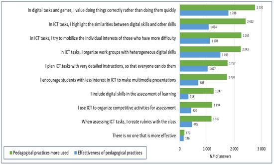 The second part of the questionnaire asked about the effective pedagogical practices that inform teachers’ use of digital technology, in a dual dimension of questioning their use and assessing their effectiveness. Figure 4 illustrates this comparative dimension. Such pedagogical practices, aligned with digital technology, could be read following two main orientations: the first one emphasizes the nature of the task itself being more assessment oriented; the second one is more framed by learning differentiation.