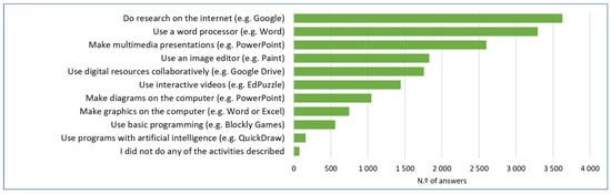 Looking now at the activities that teachers implemented in their classrooms using digital technology, one must state that such activities are related with the work performed by pupils inside the classroom or performed by them to use in the classroom. The results show that searching on the internet, using a word processor, and creating a multimedia presentation are the three most frequently mentioned practices (Figure 5). On the other hand, activities that use artificial intelligence or involve programming are mentioned less frequently and were mentioned only by a limited number of teachers.