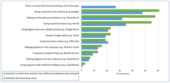 The ordered list of activities is very similar to the previous set regarding the frequency of their use by almost the entire sample: internet searches, use of word processing, and production of presentations are the activities most mentioned by the 173 teachers as those in which they notice the greatest differences between boys and girls. However, in this case, the coincidence of the trend may simply be the result of these also being the most implemented activities.