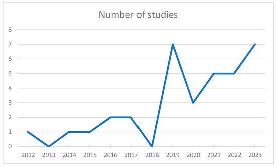 The included studies were published between 2012 (i.e., one study [100]) and 2023 (i.e., seven studies [127,128,129,130,131,132,133]). According to Figure 2, there was an increment of publications during the last years, and three-quarters of studies (i.e., [107,108,109,110,111,112,113,114,115,116,117,118,119,120,121,122,123,124,125,126,127,128,129,130,131,132,133]) were published in the last five years.