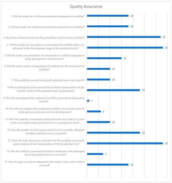 The fifteen items of the CAUSS [58], the scale that was used to evaluate the methodological quality of the included studies, considered several dimensions of the user-center usability evaluation, namely (i) usability assessment instruments (items 1 and 2), (ii) procedures (items 3, 4, 5, 6, and 15), (iii) participants (items 7, 8, and 12), (iv) study evaluators (items 9 and 10), and (v) context and tasks (items 11, 13, and 14).