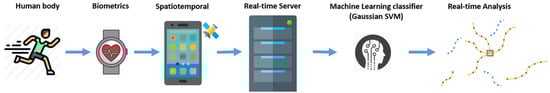 The purpose of real-time spatial analysis in monitoring panic conditions is supported by a data model as in [16], represented in Figure 3. This model processes streaming data containing spatiotemporal and biometric information collected from wearable devices and smartphones. As stated in the previous section, a Gaussian SVM machine learning classifier is utilized to distinguish between normal behavior and panic conditions, assigning the SPI values of 0 and 1, respectively. The resulting categorization labels the data as either Points of No Interest or Panic Points.