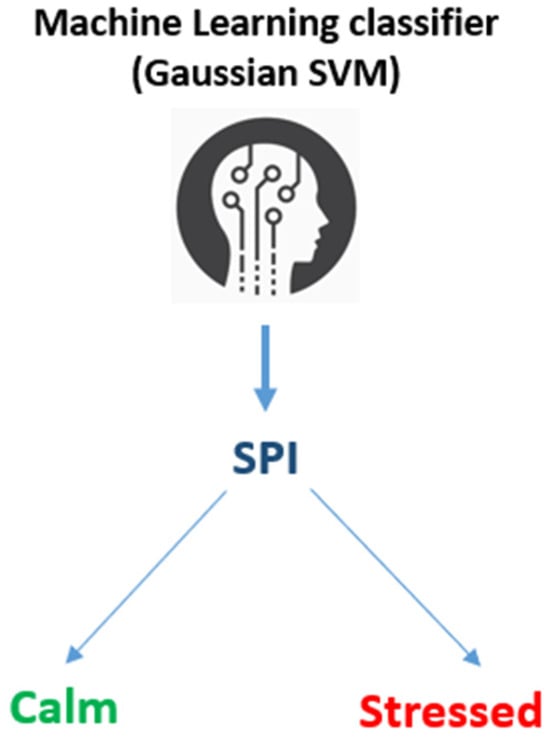 The dataset’s biometric and spatiotemporal attributes are classified into four groupings, with values informed by pertinent studies. These divisions comprise (i) biometric information (from wearables) encompassing heart rate and heart rate variability. Their values are based on studies providing relevant information; (ii) spatiotemporal information (captured by smartphones) offering location coordinates, activity type, subject velocity, and step count; (iii) descriptive data (from wearables) concerning subject gender, age, and weight; and iv) the secure ID (from smartphones) assigning a distinct identification code to each subject. Additionally, a feature named heart rate moving average deviation (HRMAD) is derived to indicate sudden panic conditions based on heart rate values. The dataset is used to train machine learning models to distinguish panic states from normal behavior. Decision trees, logistic regression, Gaussian and kernel naïve Bayes, Gaussian SVM, and SVM kernel, and boosted trees were examined in [5], with the Gaussian SVM classifier achieving the highest accuracy using the HRMAD60 feature. As a result, the SPI (Stress Profile Index) is introduced as a Boolean-valued index that indicates a Calm (value 0) or Stressed (value 1) state, as shown in Figure 2.