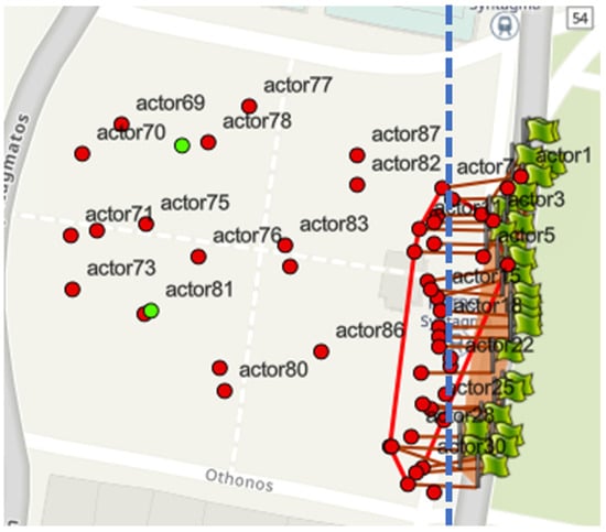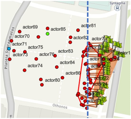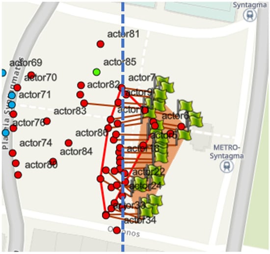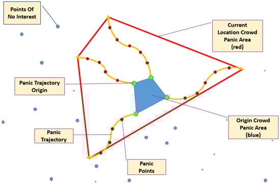 By including the time information and evaluating the live data within a time window of 10 s, the spatiotemporal correlation between Panic Points can be established, allowing for a better understanding of the patterns and trends of panic behavior. Specifically, the 10-s timeframe indicates that should a subject’s most recent location fall beyond this 10-s window, it will not affect the evaluation. These parameters are adjustable variables that enable monitoring of the model’s behavior under diverse circumstances. In the subsequent chapter focused on experimental results, we will showcase various runs involving alternative parameter values. Given that the above conditions are met, the creation of Crowd Panic Areas is triggered.
