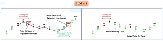 In Figure 4, two illustrative examples highlight the influence of the CLOT parameter when set to a value of three. In the example on the left, the subject initially exhibits two Points of No Interest (green dots), indicative of a state of tranquility. Subsequently, a sequential occurrence of Panic Points (red dots) ensues. Employing real-time data monitoring, the system detects that the accumulation of these Panic Points attains the predetermined CLOT value of 3. Consequently, the system designates the third successive Panic Point as the Point of Trust (POT), signifying the initiation of Panic Trajectory creation. As long as the sequence of Panic Points remains uninterrupted, the trajectory extends further. After a duration of time, Points of No Interest commence their emergence. The system vigilantly assesses whether this sequence aligns effectively with the CLOT threshold. Once the requirement is met, affirming the presence of at least three consecutive Points of No Interest, the Panic Trajectory is terminated accordingly. Conversely, in the example on the right, an alternative subject exhibits a composed behavior, and the subsequent Panic Points fail to surpass the CLOT threshold of 3. Consequently, the system classifies them as noise, resulting in the absence of any trajectory formation.